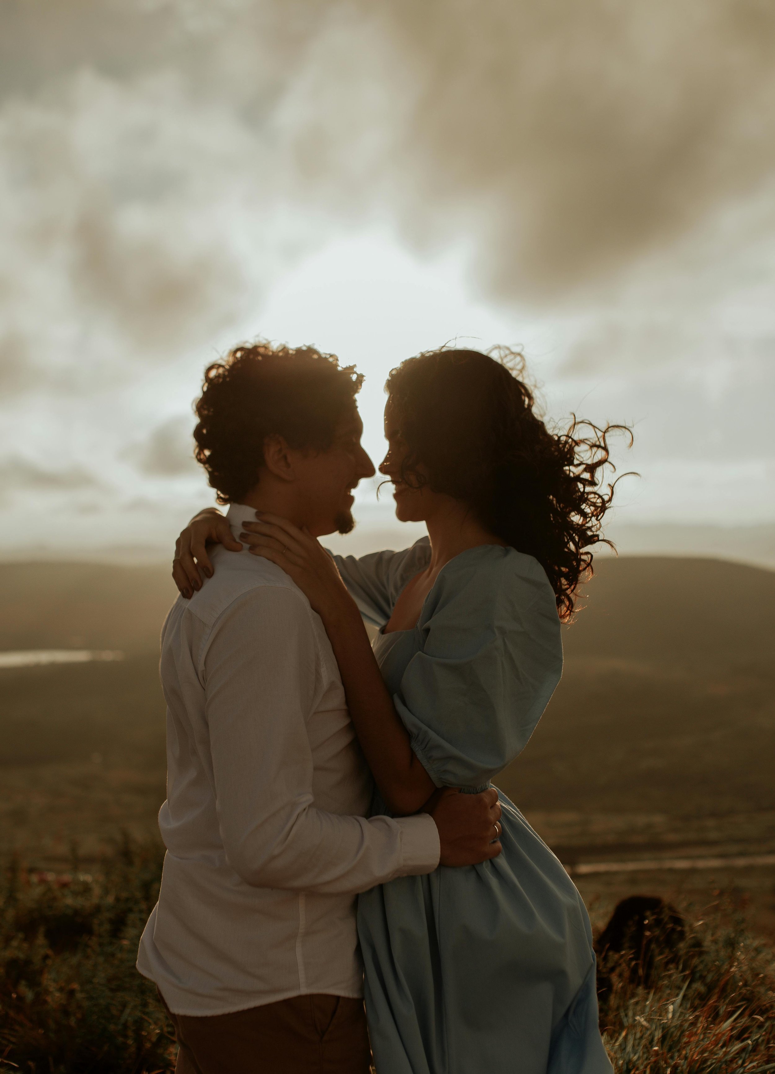 A couple standing outdoors in a field at sunset, embracing and looking at each other affectionately, with clouds and the setting sun in the background.